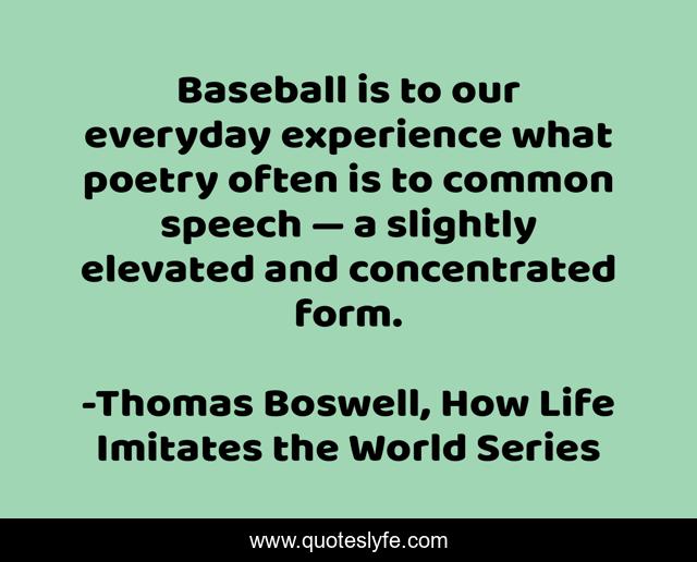 This page presents the quote "Baseball is to our everyday experience what poetry often is to common speech — a slightly elevated and concentrated form.". Author of this quote is Thomas Boswell, How Life Imitates the World Series. This quote is about baseball, concentration, speech, life, poetry,.