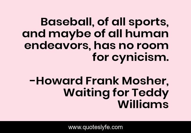 This page presents the quote "Baseball, of all sports, and maybe of all human endeavors, has no room for cynicism.". Author of this quote is Howard Frank Mosher, Waiting for Teddy Williams. This quote is about baseball, sports,.