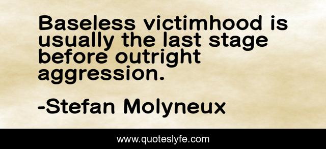 This page presents the quote "Baseless victimhood is usually the last stage before outright aggression.". Author of this quote is Stefan Molyneux. This quote is about self-knowledge, psychology, unconscious, mindfulness, philosophy, victim-mentality, victim,.