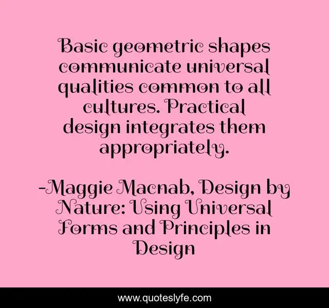 "Maggie Macnab, Design by Nature: Using Universal Forms and Principles in Design Quotes." Quoteslyfe.com, 2025. Fri. 05 Dec. 2025. <https://www.quoteslyfe.com/quote/Basic-geometric-shapes-communicate-universal-qualities-common-256186>.