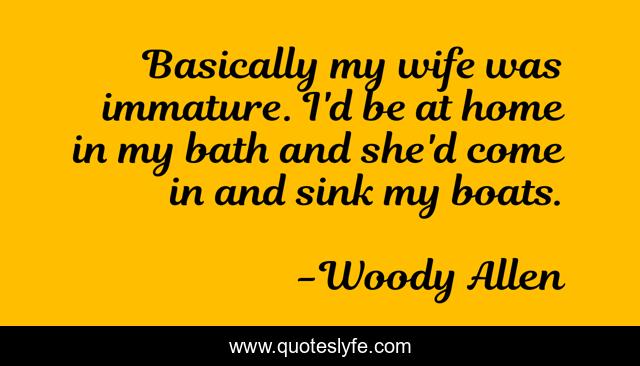 This page presents the quote "Basically my wife was immature. I'd be at home in my bath and she'd come in and sink my boats.". Author of this quote is Woody Allen. .