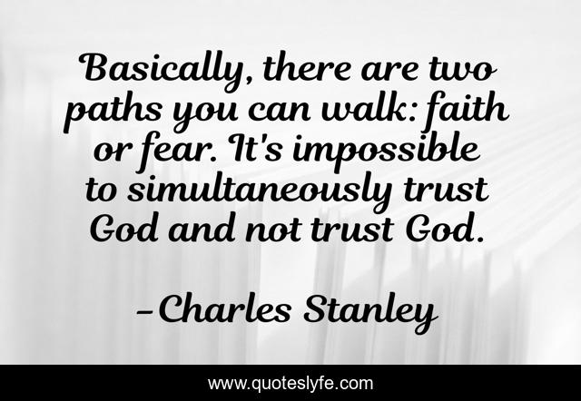 This page presents the quote "Basically, there are two paths you can walk: faith or fear. It's impossible to simultaneously trust God and not trust God.". Author of this quote is Charles Stanley. This quote is about faith, fear, trust,.