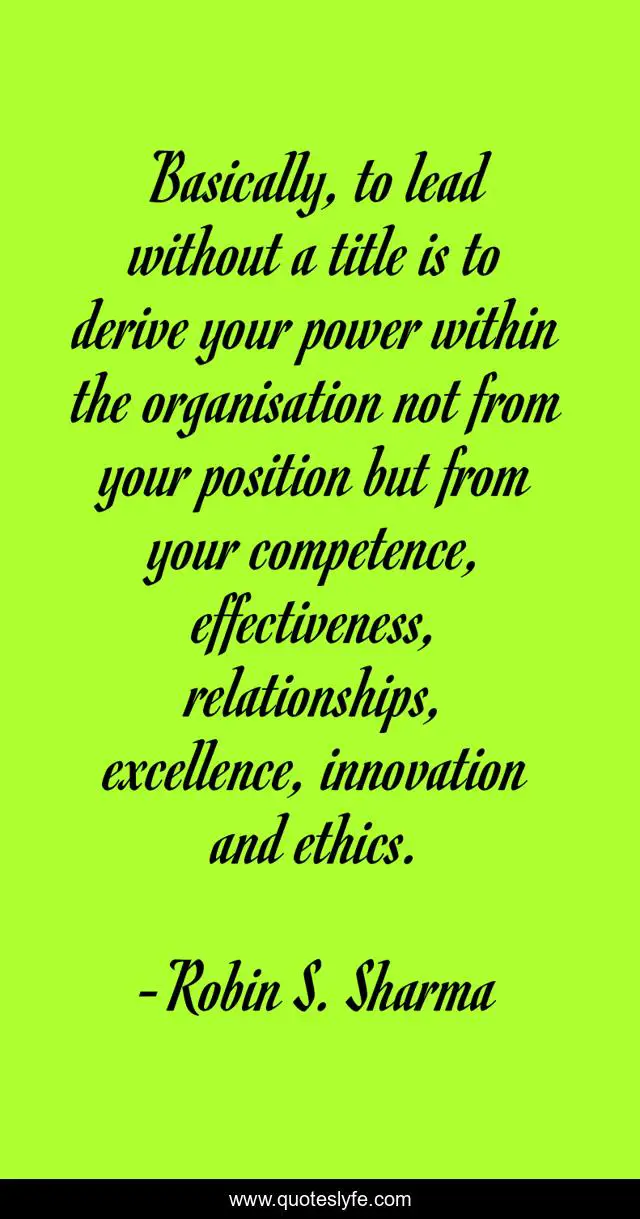 This page presents the quote "Basically, to lead without a title is to derive your power within the organisation not from your position but from your competence, effectiveness, relationships, excellence, innovation and ethics.". Author of this quote is Robin S. Sharma. This quote is about excellence, innovation,.