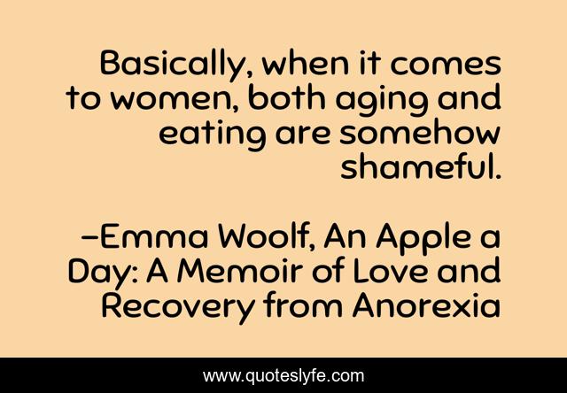 This page presents the quote "Basically, when it comes to women, both aging and eating are somehow shameful.". Author of this quote is Emma Woolf, An Apple a Day: A Memoir of Love and Recovery from Anorexia. This quote is about eating-disorder, recovery, anorexia,.