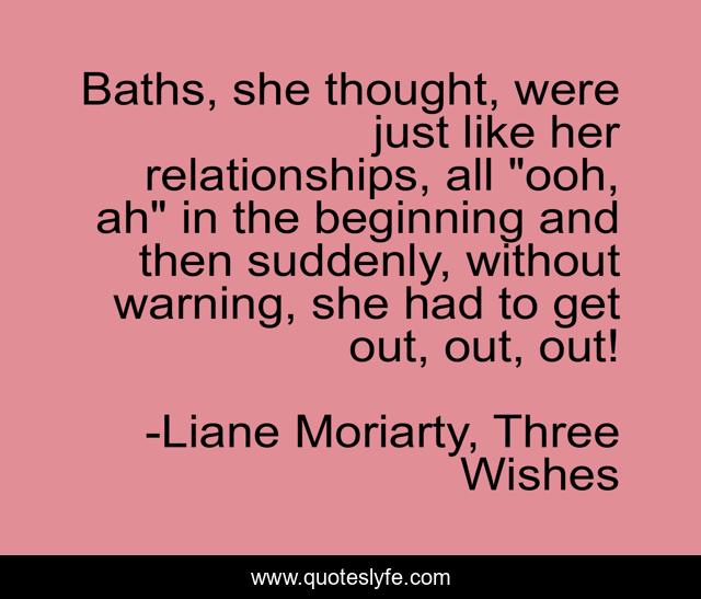 This page presents the quote "Baths, she thought, were just like her relationships, all "ooh, ah" in the beginning and then suddenly, without warning, she had to get out, out, out!". Author of this quote is Liane Moriarty, Three Wishes. .
