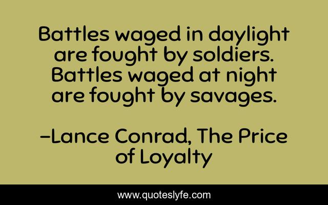 This page presents the quote "Battles waged in daylight are fought by soldiers. Battles waged at night are fought by savages.". Author of this quote is Lance Conrad, The Price of Loyalty. This quote is about savage, savages, warriors, battles, night, soldiers, day,.