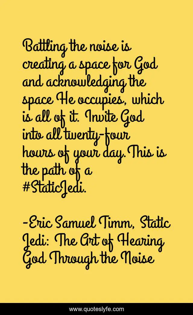 This page presents the quote "Battling the noise is creating a space for God and acknowledging the space He occupies, which is all of it. Invite God into all twenty-four hours of your day.This is the path of a #StaticJedi.". Author of this quote is Eric Samuel Timm, Static Jedi: The Art of Hearing God Through the Noise. This quote is about faith, bible, christ, god, static-jedi, jesus, eric-samuel-timm, church, lord,.