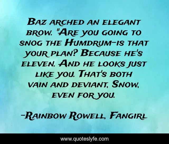 This page presents the quote "Baz arched an elegant brow. "Are you going to snog the Humdrum-is that your plan? Because he's eleven. And he looks just like you. That's both vain and deviant, Snow, even for you.". Author of this quote is Rainbow Rowell, Fangirl. This quote is about baz, humor, simon-snow, lgbt,.