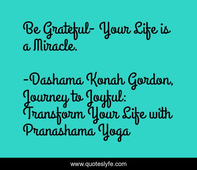 This page presents the quote "Be Grateful- Your Life is a Miracle.". Author of this quote is Dashama Konah Gordon, Journey to Joyful: Transform Your Life with Pranashama Yoga. This quote is about miracles, love, enthusiasm, inspirational, yoga-inspiration, yoga, happiness, affection, inspiration,.
