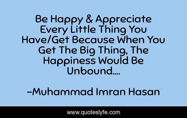 "Muhammad Imran Hasan Quotes." Quoteslyfe.com, 2025. Sun. 07 Dec. 2025. <https://www.quoteslyfe.com/quote/Be-Happy-Appreciate-Every-Little-Thing-You-95474>.