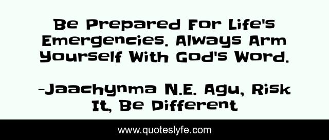 This page presents the quote "Be Prepared For Life's Emergencies. Always Arm Yourself With God's Word.". Author of this quote is Jaachynma N.E. Agu, Risk It, Be Different. This quote is about accomplishments, higher-life, success, greatness,.