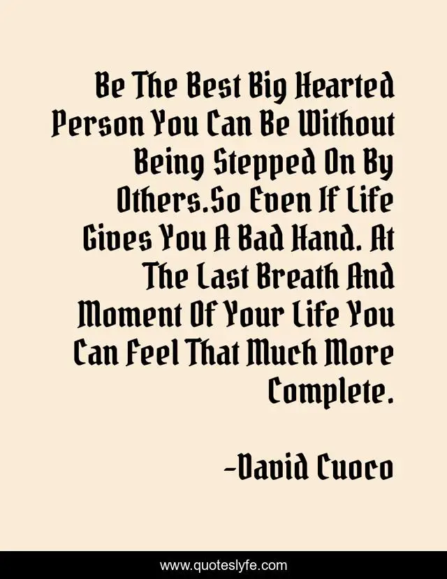 This page presents the quote "Be The Best Big Hearted Person You Can Be Without Being Stepped On By Others.So Even If Life Gives You A Bad Hand. At The Last Breath And Moment Of Your Life You Can Feel That Much More Complete.". Author of this quote is David Cuoco. .