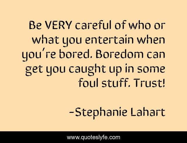 This page presents the quote "Be VERY careful of who or what you entertain when you’re bored. Boredom can get you caught up in some foul stuff. Trust!". Author of this quote is Stephanie Lahart. This quote is about single-life, food-for-thought, lonely, single-woman, relationship, quote, loneliness, stephanie-lahart, quotes,.
