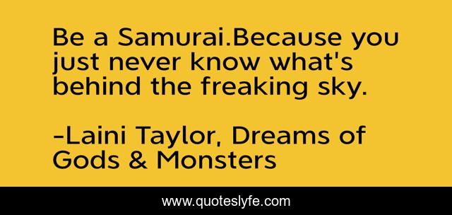 This page presents the quote "Be a Samurai.Because you just never know what's behind the freaking sky.". Author of this quote is Laini Taylor, Dreams of Gods & Monsters. This quote is about funny, comedy, zuzana, samurai,.