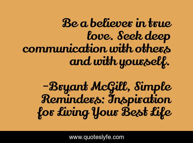 This page presents the quote "Be a believer in true love. Seek deep communication with others and with yourself.". Author of this quote is Bryant McGill, Simple Reminders: Inspiration for Living Your Best Life. This quote is about love, seeking, communication, trueness, beliefs, affection,.