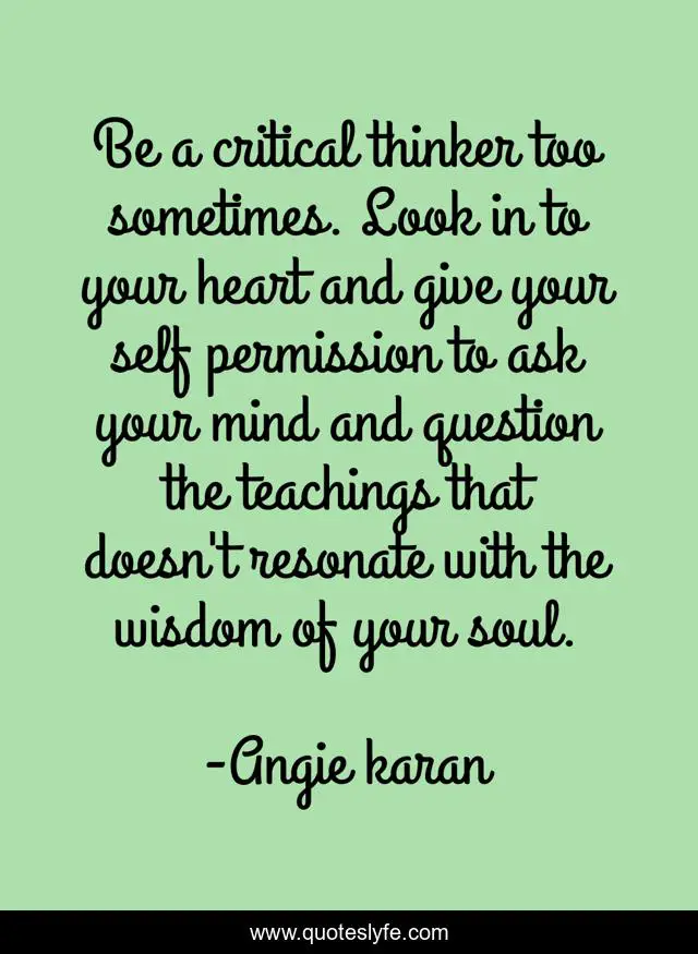 This page presents the quote "Be a critical thinker too sometimes. Look in to your heart and give your self permission to ask your mind and question the teachings that doesn't resonate with the wisdom of your soul.". Author of this quote is Angie karan. This quote is about wisdom-of-your-soul, permission, mind, critical-thinker, thinker, resonance,.