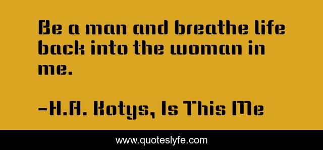 This page presents the quote "Be a man and breathe life back into the woman in me.". Author of this quote is H.A. Kotys, Is This Me. .