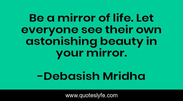 This page presents the quote "Be a mirror of life. Let everyone see their own astonishing beauty in your mirror.". Author of this quote is Debasish Mridha. This quote is about see-the-beauty-in-others, inspirational, beauty, philosophy, debasish-mridha, quotes, debasish-mridha-md, mirror-of-life, enthusiasm,.