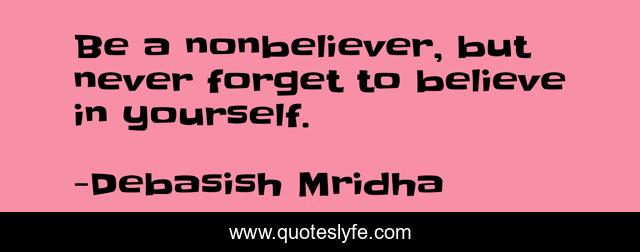 This page presents the quote "Be a nonbeliever, but never forget to believe in yourself.". Author of this quote is Debasish Mridha. This quote is about be-a-nonbeliever, believe-in-yourself, philosophy, debasish-mridha, quotes, inspirational, enthusiasm, debasish-mridha-m-d,.