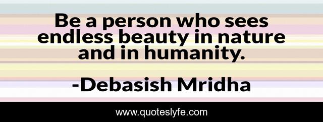This page presents the quote "Be a person who sees endless beauty in nature and in humanity.". Author of this quote is Debasish Mridha. This quote is about life, love, knowledge, inspirational, intelligence, philosophy, wisdom, quotes, affection,.