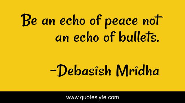 This page presents the quote "Be an echo of peace not an echo of bullets.". Author of this quote is Debasish Mridha. This quote is about peace, philosophy, debasish-mridha, quotes, bullets, debasish-mridha-md, inspirational, enthusiasm, echo-of-peace,.