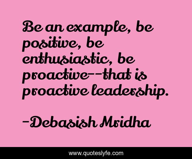 This page presents the quote "Be an example, be positive, be enthusiastic, be proactive--that is proactive leadership.". Author of this quote is Debasish Mridha. This quote is about confidence, debasish, mridha, enthusiastic, philosophy, debasish-mridha, good-leadership, positive, be-proactive,.