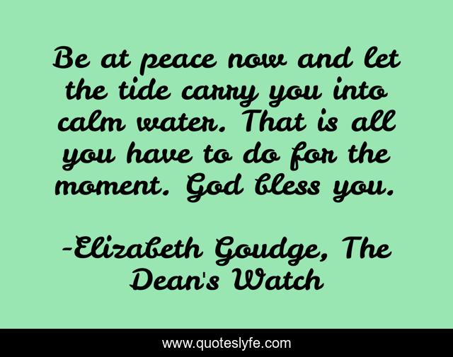 This page presents the quote "Be at peace now and let the tide carry you into calm water. That is all you have to do for the moment. God bless you.". Author of this quote is Elizabeth Goudge, The Dean's Watch. .