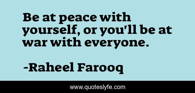 This page presents the quote "Be at peace with yourself, or you'll be at war with everyone.". Author of this quote is Raheel Farooq. This quote is about peace-of-mind, cool-down, peace, peaceful-mind, self-control,.