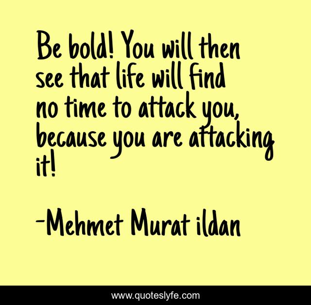 This page presents the quote "Be bold! You will then see that life will find no time to attack you, because you are attacking it!". Author of this quote is Mehmet Murat ildan. This quote is about life, murat-ildan, life-and-sayings, attack, courage, being-bold, life-philosophy,.
