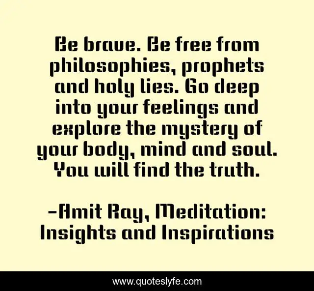 This page presents the quote "Be brave. Be free from philosophies, prophets and holy lies. Go deep into your feelings and explore the mystery of your body, mind and soul. You will find the truth.". Author of this quote is Amit Ray, Meditation: Insights and Inspirations. This quote is about body, religion-and-science, religion-spirituality, prophets, religion-and-philosophy, mind-and-soul, religion, scientist, holy-lies,.