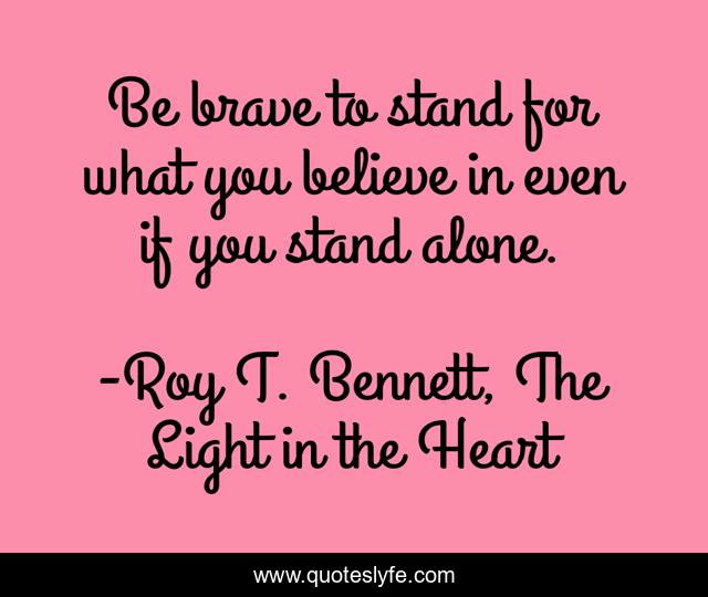 This page presents the quote "Be brave to stand for what you believe in even if you stand alone.". Author of this quote is Roy T. Bennett, The Light in the Heart. This quote is about living, inspiring, belief, inspiration, positive, positive-affirmation, motivational, life, confidence,.