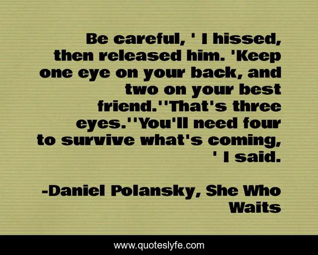 This page presents the quote "Be careful, ' I hissed, then released him. 'Keep one eye on your back, and two on your best friend.''That's three eyes.''You'll need four to survive what's coming, ' I said.". Author of this quote is Daniel Polansky, She Who Waits. This quote is about humor, humour,.