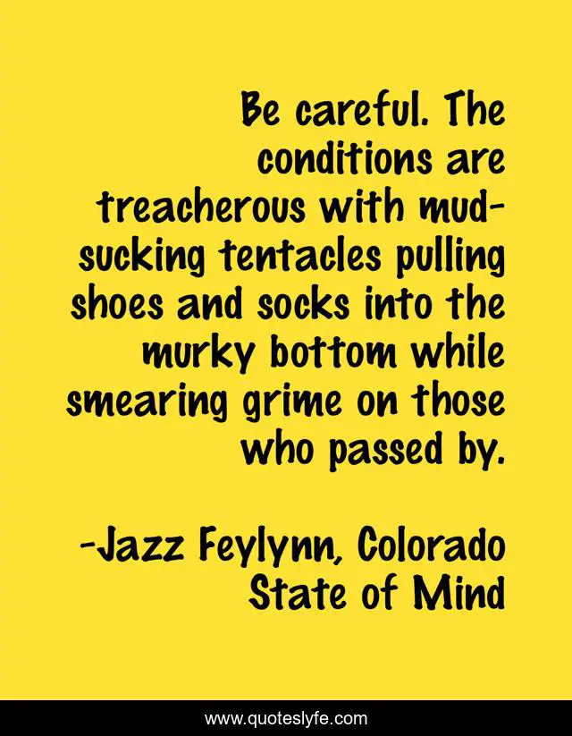 This page presents the quote "Be careful. The conditions are treacherous with mud-sucking tentacles pulling shoes and socks into the murky bottom while smearing grime on those who passed by.". Author of this quote is Jazz Feylynn, Colorado State of Mind. This quote is about shoes-and-socks, sucking, pulling-shoes-and-socks, green-man, treacherous, paranormal, passes-by, smearing-grime, murky-bottom,.