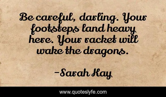 This page presents the quote "Be careful, darling. Your footsteps land heavy here. Your racket will wake the dragons.". Author of this quote is Sarah Kay. This quote is about verse, poetry, dragons,.