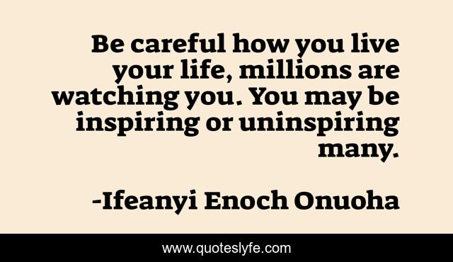 This page presents the quote "Be careful how you live your life, millions are watching you. You may be inspiring or uninspiring many.". Author of this quote is Ifeanyi Enoch Onuoha. This quote is about enthusiasm, ifeanyi-enoch-onuoha, legacy, motivation, inspirational,.