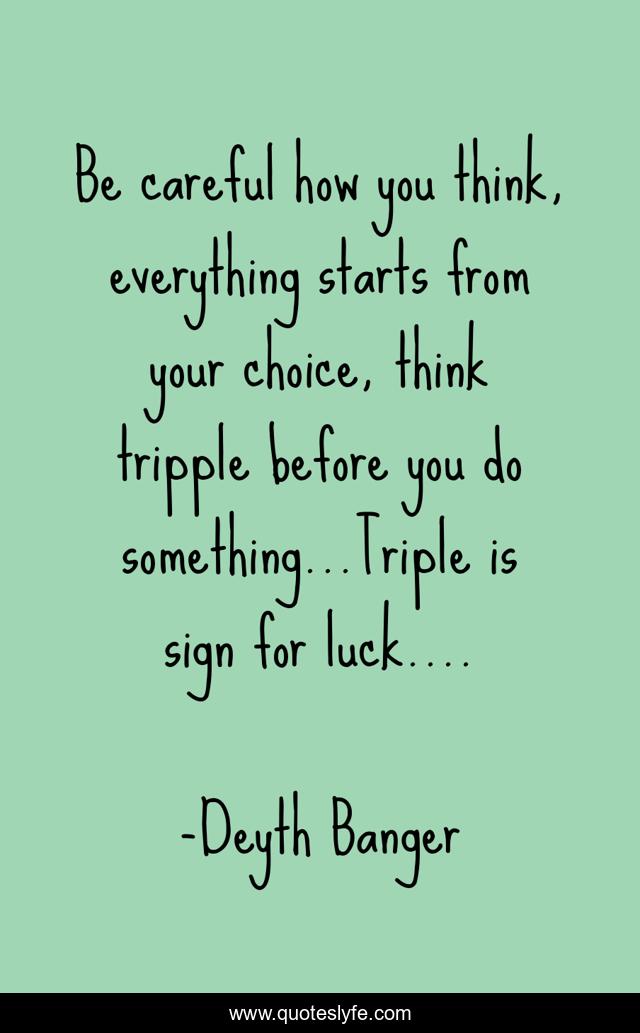 This page presents the quote "Be careful how you think, everything starts from your choice, think tripple before you do something...Triple is sign for luck....". Author of this quote is Deyth Banger. This quote is about starts, careful, think-everything, luck,.