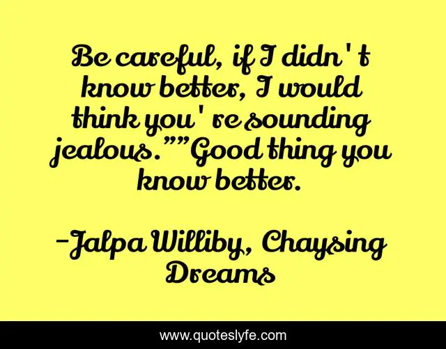 This page presents the quote "Be careful, if I didn't know better, I would think you're sounding jealous.""Good thing you know better.". Author of this quote is Jalpa Williby, Chaysing Dreams. This quote is about romance-novel, suspense,.
