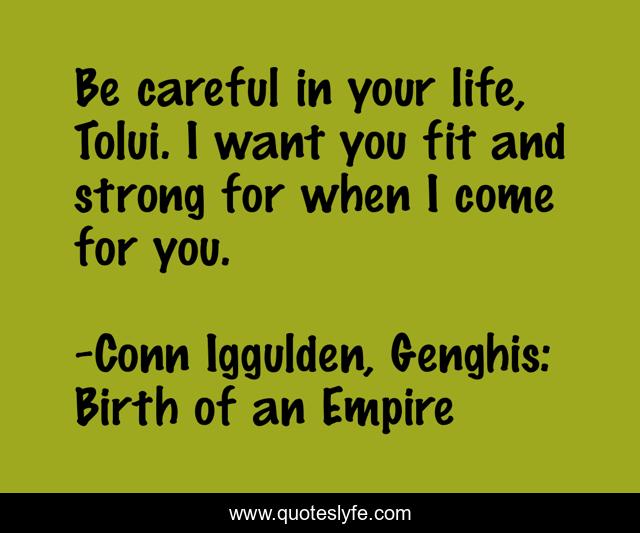 This page presents the quote "Be careful in your life, Tolui. I want you fit and strong for when I come for you.". Author of this quote is Conn Iggulden, Genghis: Birth of an Empire. .