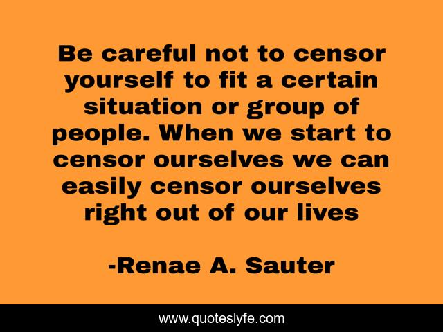 This page presents the quote "Be careful not to censor yourself to fit a certain situation or group of people. When we start to censor ourselves we can easily censor ourselves right out of our lives". Author of this quote is Renae A. Sauter. This quote is about motivation, psychology, personal-growth, mental-health, mind-body-spirit, self-help, inspiration,.
