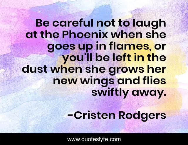 This page presents the quote "Be careful not to laugh at the Phoenix when she goes up in flames, or you'll be left in the dust when she grows her new wings and flies swiftly away.". Author of this quote is Cristen Rodgers. This quote is about spiritual, acceptance, flames, phoenix, mockery, compassion, renewal, mocking, spirituality,.