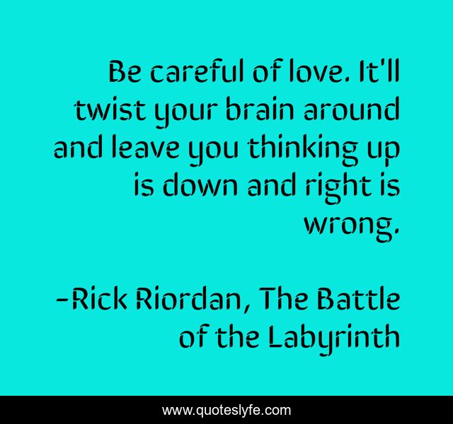 This page presents the quote "Be careful of love. It'll twist your brain around and leave you thinking up is down and right is wrong.". Author of this quote is Rick Riordan, The Battle of the Labyrinth. This quote is about love, affection,.