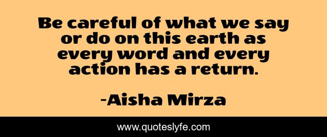 This page presents the quote "Be careful of what we say or do on this earth as every word and every action has a return.". Author of this quote is Aisha Mirza. This quote is about action, islamic, life, life-lessons, words,.