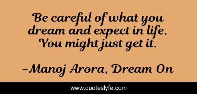 This page presents the quote "Be careful of what you dream and expect in life. You might just get it.". Author of this quote is Manoj Arora, Dream On. This quote is about life, dream-big, dreams-inspirational, expect, dreaming, life-philosophy, life-and-living, dream, dreams,.