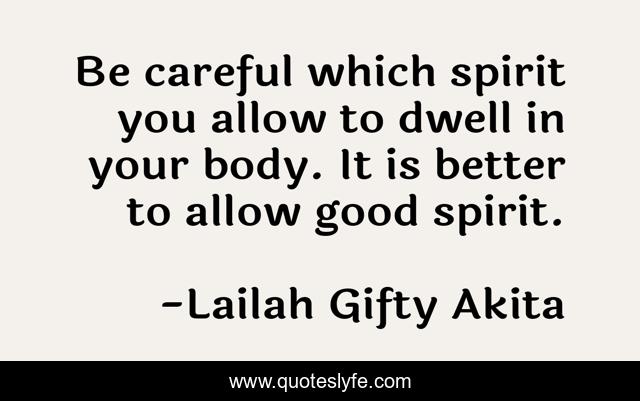 This page presents the quote "Be careful which spirit you allow to dwell in your body. It is better to allow good spirit.". Author of this quote is Lailah Gifty Akita. This quote is about body, good-spirit, spiritual, self-awareness, encouragement,.