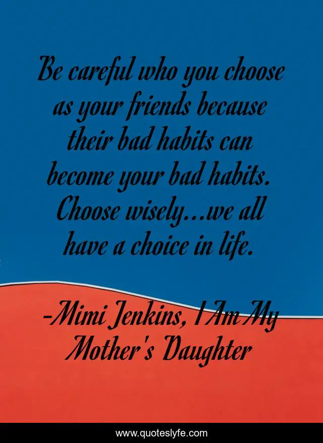 This page presents the quote "Be careful who you choose as your friends because their bad habits can become your bad habits. Choose wisely...we all have a choice in life.". Author of this quote is Mimi Jenkins, I Am My Mother's Daughter. This quote is about love, contemporary-romance, fiction, adventure, inspirational, faith-battle, enthusiasm, adversity, affection,.