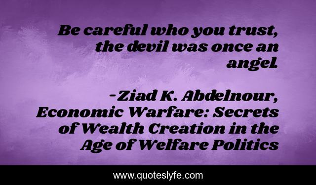This page presents the quote "Be careful who you trust, the devil was once an angel.". Author of this quote is Ziad K. Abdelnour, Economic Warfare: Secrets of Wealth Creation in the Age of Welfare Politics. This quote is about devil, angel,.