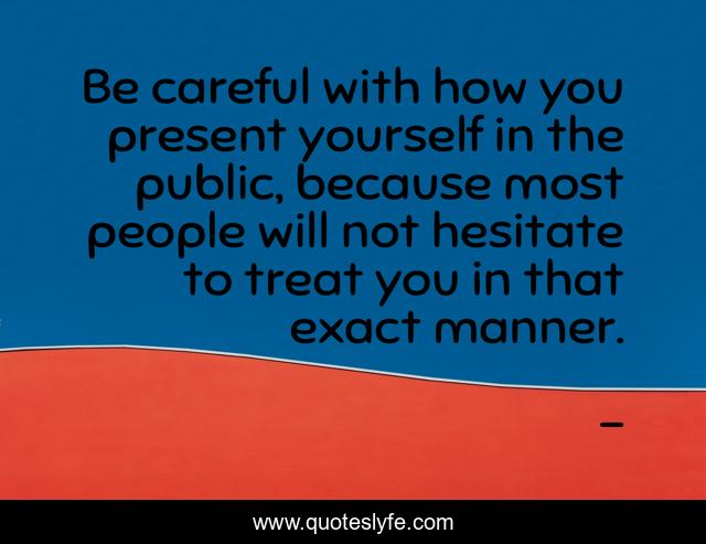 This page presents the quote "Be careful with how you present yourself in the public, because most people will not hesitate to treat you in that exact manner.". Author of this quote is . This quote is about edmond-mbiaka, good-manner, good-mannerism, present-yourself-well, think-before-you-act,.