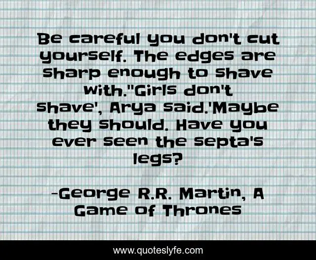 Be careful you don't cut yourself. The edges are sharp enough to shave with.''Girls don't shave', Arya said.'Maybe they should. Have you ever seen the septa's legs?
