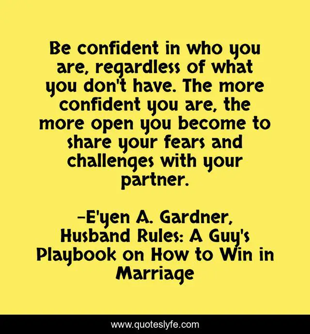 This page presents the quote "Be confident in who you are, regardless of what you don't have. The more confident you are, the more open you become to share your fears and challenges with your partner.". Author of this quote is E'yen A. Gardner, Husband Rules: A Guy's Playbook on How to Win in Marriage. This quote is about confidence, be-true-to-yourself, relationship-advice, marriage-advice,.
