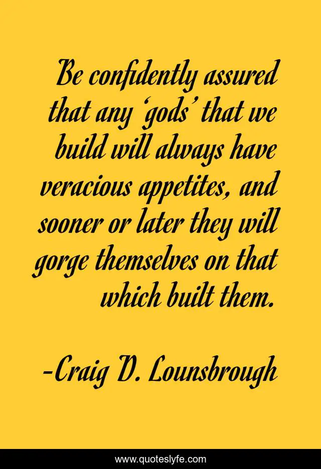 This page presents the quote "Be confidently assured that any ‘gods’ that we build will always have veracious appetites, and sooner or later they will gorge themselves on that which built them.". Author of this quote is Craig D. Lounsbrough. This quote is about selfish, gods, create, false-gods, build, god, idols,.